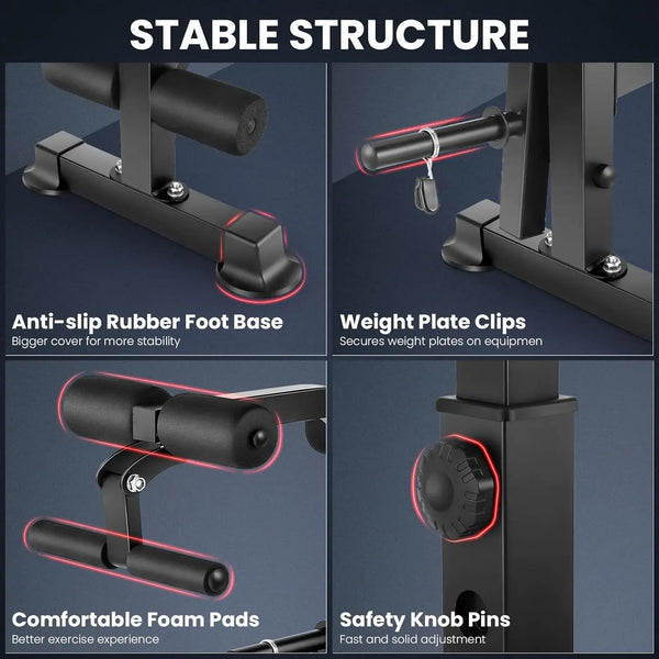 Say goodbye to boring routines! This all-in-one bench set lets you mix things up with exercises like bench press, squats, and curls. You'll never get stuck in a fitness rut again, keeping your motivation high and your body challenged.